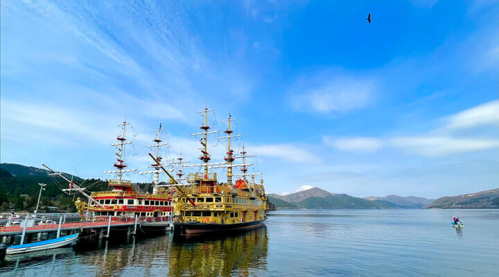 次の元箱根港までは約10分、桃源台港までは約25分の優雅なクルーズを色鮮やかな海賊船で楽しめます。