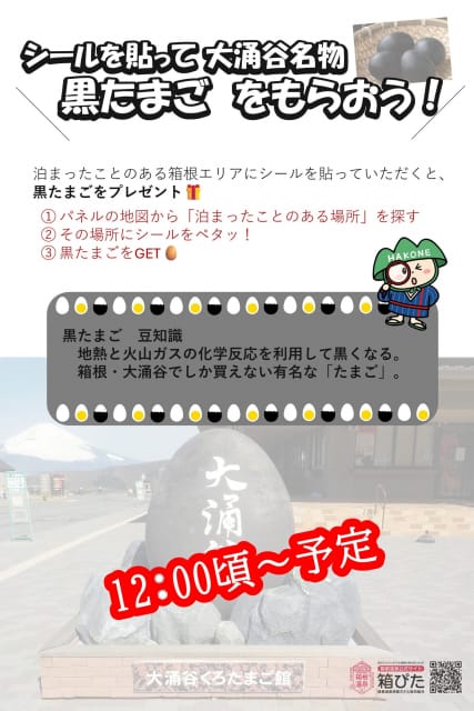 箱根の泊まったことのあるエリアにシールを貼っていただくと、黒たまご一つプレゼント!