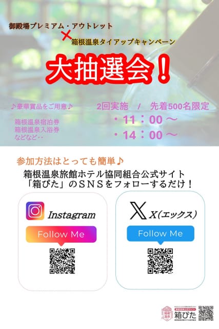 箱根温泉旅館ホテル協同組合 公式サイト「箱ぴた」SNSをフォローしていただいた方対象に、抽選会を実施します!