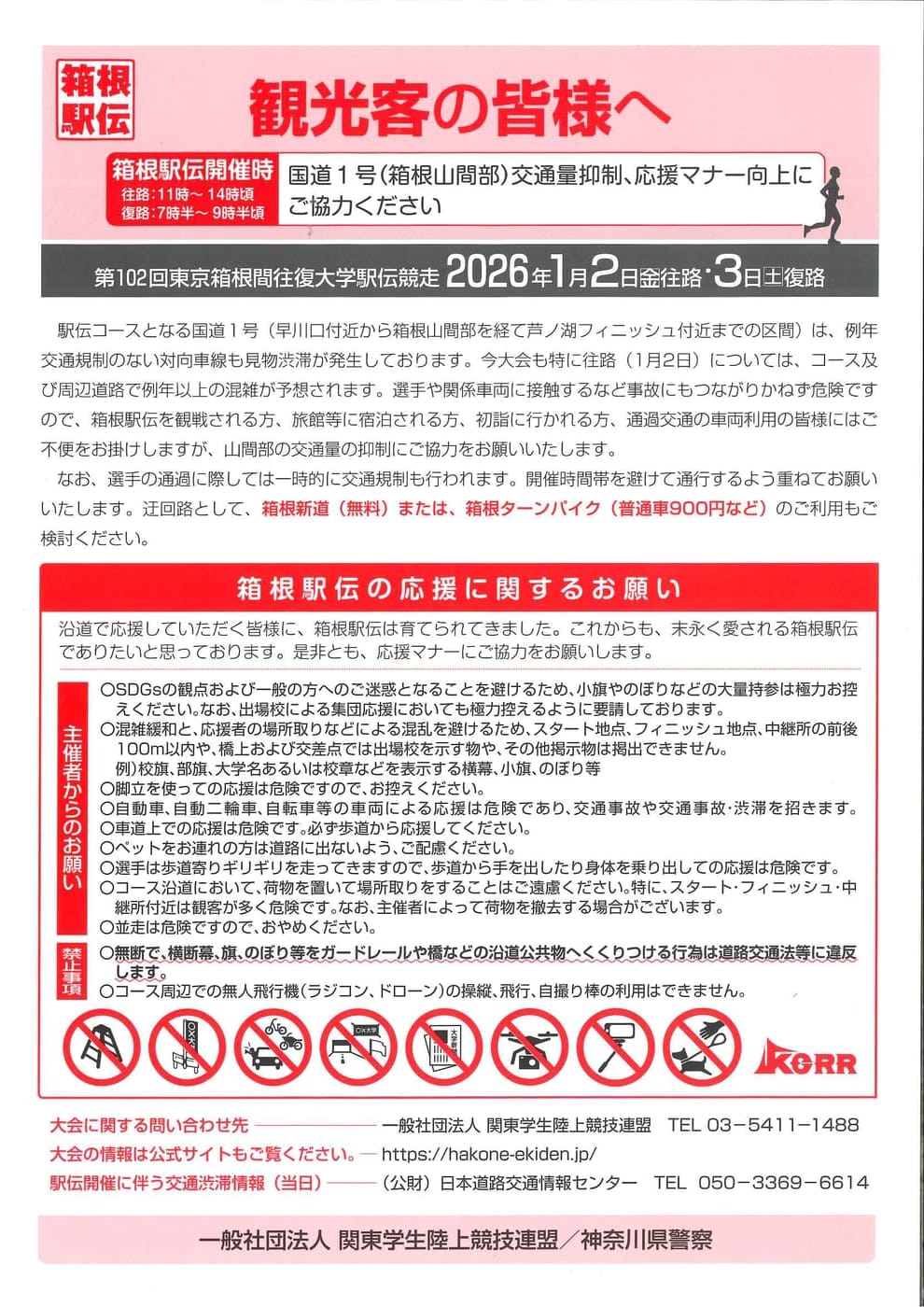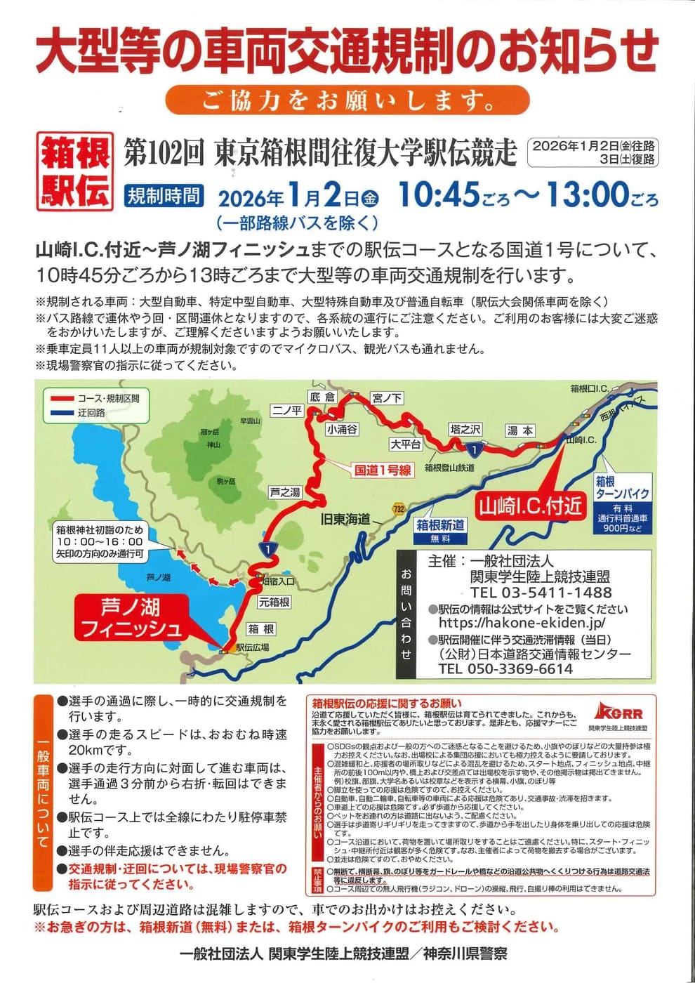 2026年1月2日(金・往路)・3日(土・復路)は、第102回東京箱根間往復大学駅伝競走が開催されます。それに伴い、駅伝コースとなります国道1号線は交通規制等が行われます。 観光にお越しの方は、交通規制のお知らせ等をご覧くださいますようお願い申し上げます。