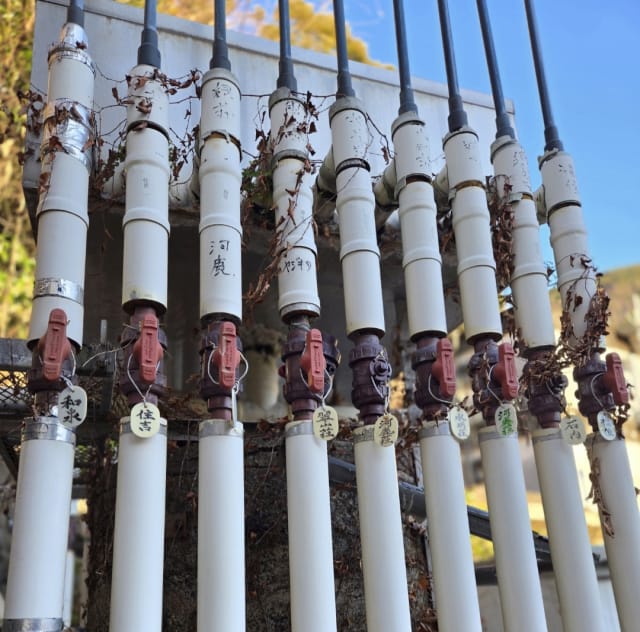 神社の階段下には箱根温泉発祥の地の石碑、源泉からは旅館の名札がついたパイプがたくさん出ていました。