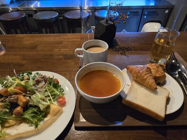 サラダクレープ(2種から1つ選択)とパンやスープ、コーヒーはビュッフェ形式で。