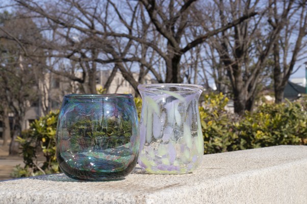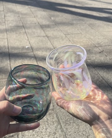 左は、シャボン玉のような色合いで、ぷっくりと丸いグラス。