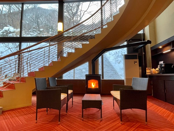 ロビーの暖炉に近づき、雪道の寒さをほどいていきます。