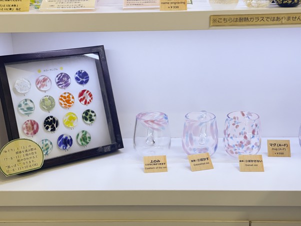 店内の棚には、デザインや形、加工などの見本となるグラスがずらり。