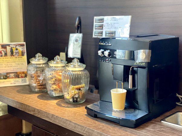 案内の通りに進むと、暖炉の横には、カフェオレやコーヒー、そしてお菓子がいつでも自由にいただけるようなスペースが。