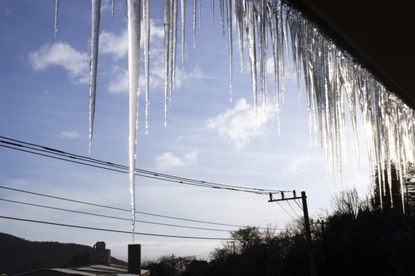 雪景色と、屋根から下がる氷柱。