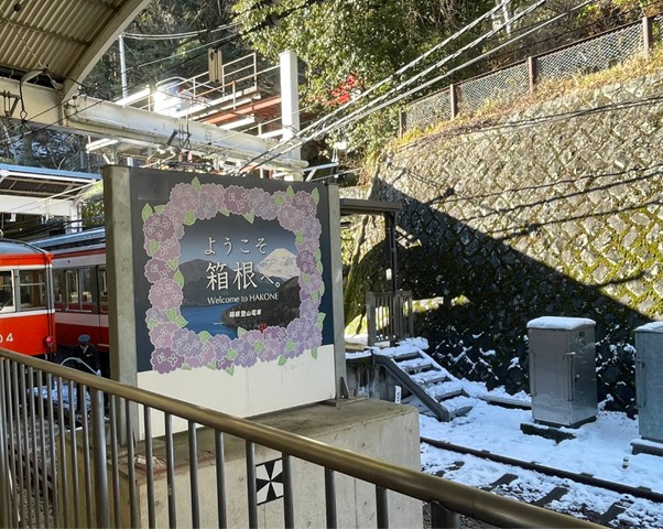 雪の影響で交通機関の乱れが心配されましたが、私たちが乗る箱根登山電車と箱根登山ケーブルは運転再開していました。