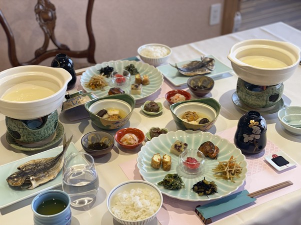 窓から差し込む光で目を覚ましました。朝食会場へ向かうと、そこには湯葉や干物を中心とした彩豊かなお膳が。
