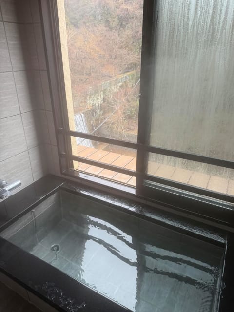 私たちが宿泊したのは川沿いのお部屋で温泉のお風呂付きで、川の音を聴